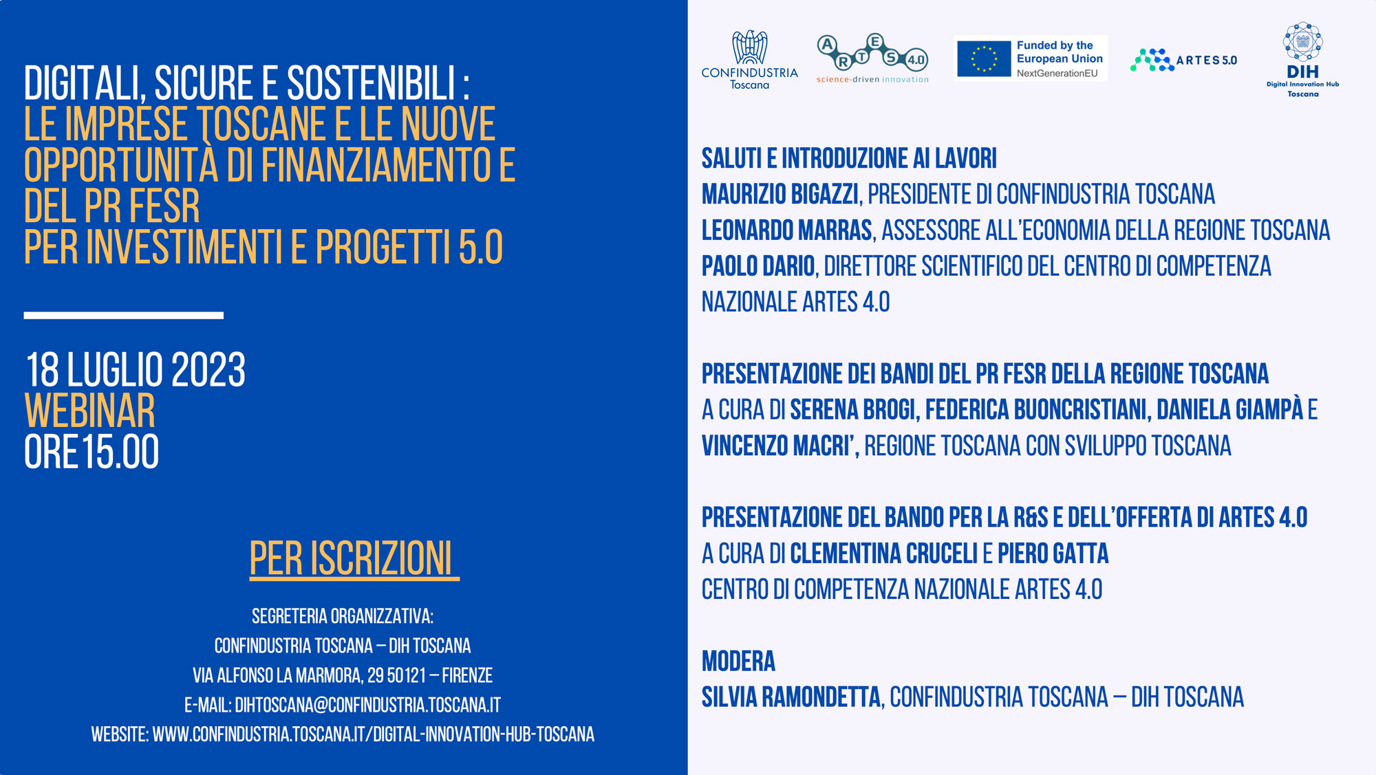 Il prossimo 18 luglio alle ore 15:00 si terrà il webinar “Digitali, Sicure e Sostenibili: le imprese toscane e le nuove opportunità di finanziamento e del PR FESR per investimenti e progetti 5.0” organizzato da Confindustria Toscana e Digital Innovation Hub Toscana.