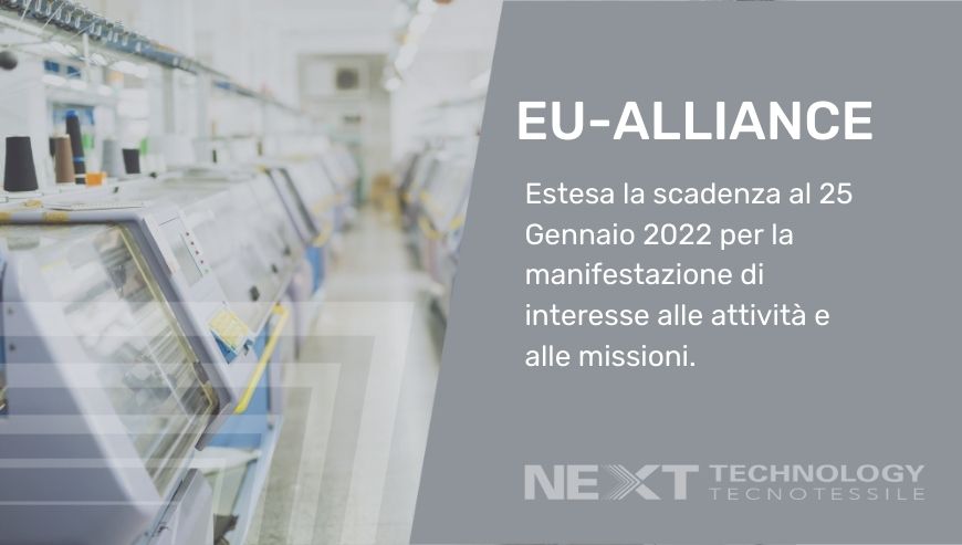 Il progetto EU-ALLIANCE che mira a supportare il processo di internazionalizzazione delle PMI nei settori del tessile tecnico, materiali avanzati, connettività e delle tecnologie innovative, ha deciso di estendere la scadenza per la presentazioni di manifestazione di interesse (“Call for Interest”) al 25 Gennaio 2022.