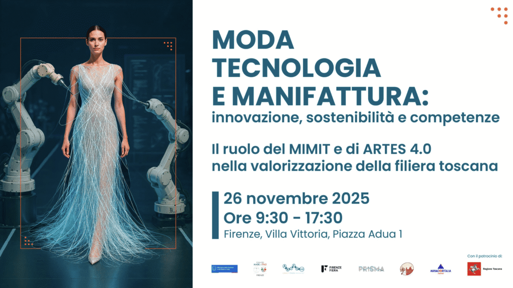 Mercoledì 26 novembre 2025, a Firenze, presso Villa Vittoria (Piazza Adua), si terrà l’evento “Moda, tecnologia e manifattura: innovazione, sostenibilità e competenze – Il ruolo del MIMIT e di ARTES 4.0 nella valorizzazione della filiera toscana”.